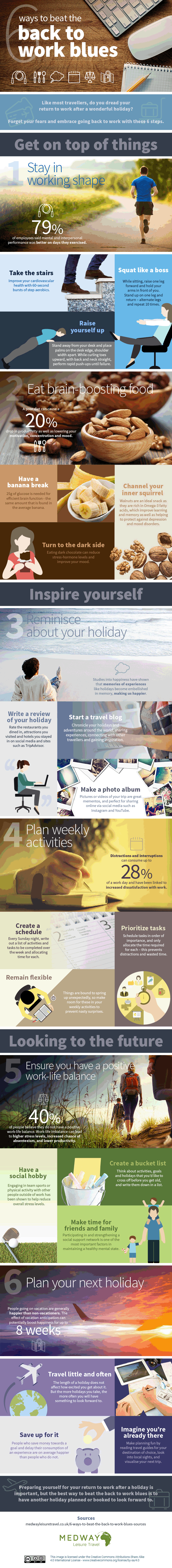 From exercising to eating brain-boosting foods, find out how to get back into work mode with the infographic below.